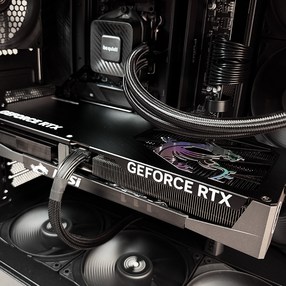 Il pc è mantenuto fresco e performante grazie ad un ottimo airflow, garantito da 3 ventole inferiori be quiet! Pure Wings 3 PWM Reverse da 120mm, da 3 ventole laterali be quiet! Pure Wings 3 PWM Reverse da 120mm e da una ventola posteriore be quiet! Pure Wings 3 PWM da 120mm. Il processore è raffreddato da un dissipatore a liquido be quiet! Pure Loop 3, il cui radiatore da 360mm è montato nella parte superiore del case con 3 ventole be quiet! Pure Wings 3 PWM.