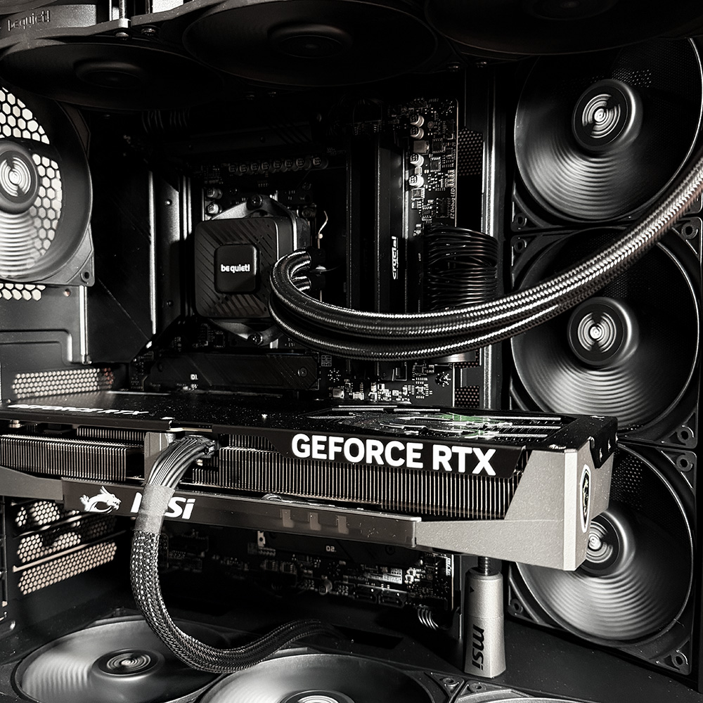 Il pc è mantenuto fresco e performante grazie ad un ottimo airflow, garantito da 3 ventole inferiori be quiet! Pure Wings 3 PWM Reverse da 120mm, da 3 ventole laterali be quiet! Pure Wings 3 PWM Reverse da 120mm e da una ventola posteriore be quiet! Pure Wings 3 PWM da 120mm. Il processore è raffreddato da un dissipatore a liquido be quiet! Pure Loop 3, il cui radiatore da 360mm è montato nella parte superiore del case con 3 ventole be quiet! Pure Wings 3 PWM. Inoltre, per abbassare ulteriormente la temperatura della CPU, è stato utilizzato in fase di installazione un Contact Sealing Frame Thermal Grizzly, utile anche per proteggere e distribuire meglio la pressione della CPU sul socket.