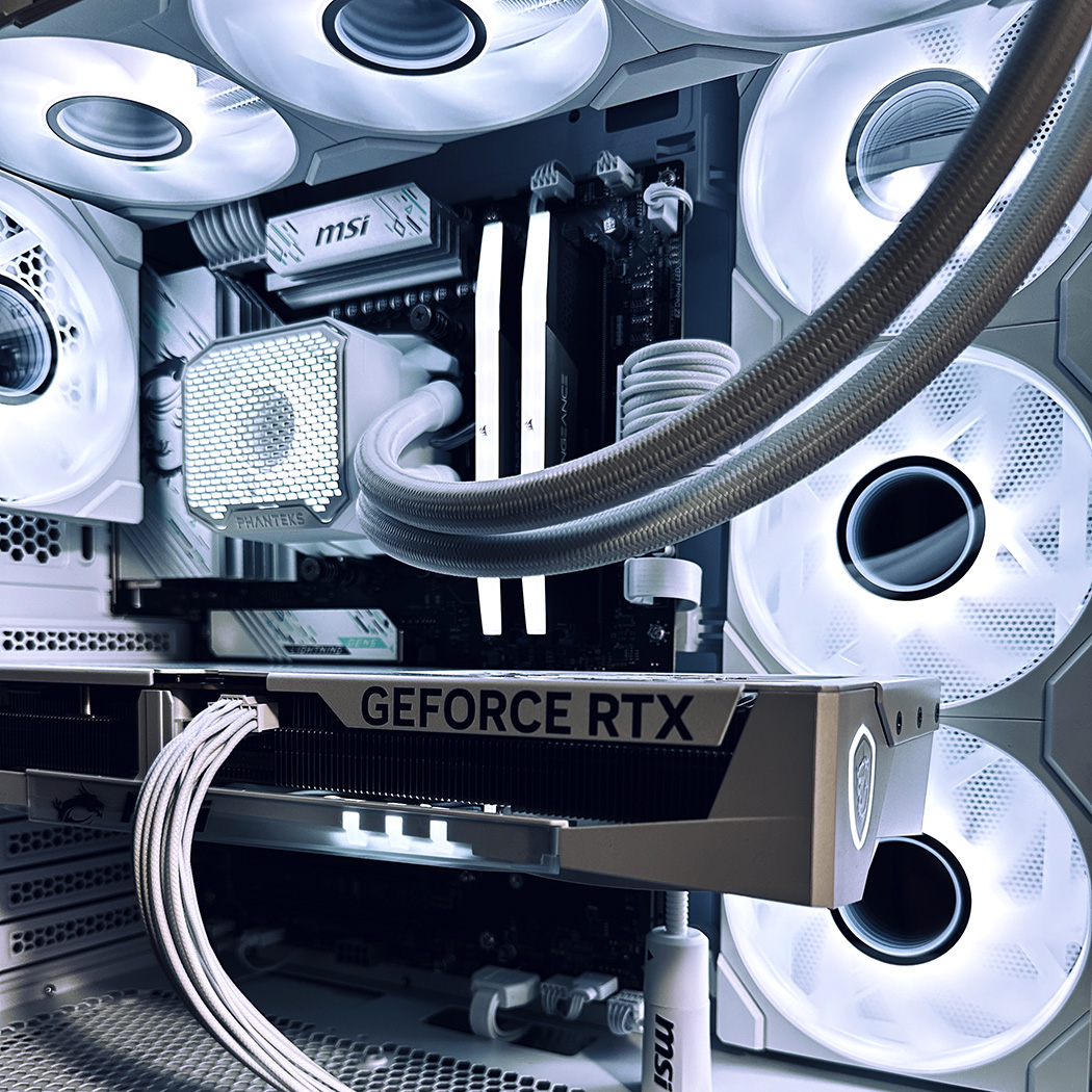 Il pc è mantenuto fresco e performante grazie ad un ottimo airflow, garantito da 3 ventole laterali Phanteks M25G2 reverse da 120mm e da una ventola posteriore Phanteks M25G2 regular da 120mm. Il processore è raffreddato da un dissipatore a liquido Phanteks Glacier One 360 M25G2 bianco, il cui radiatore è montato nella parte superiore del case con 3 ventole da 120mm.